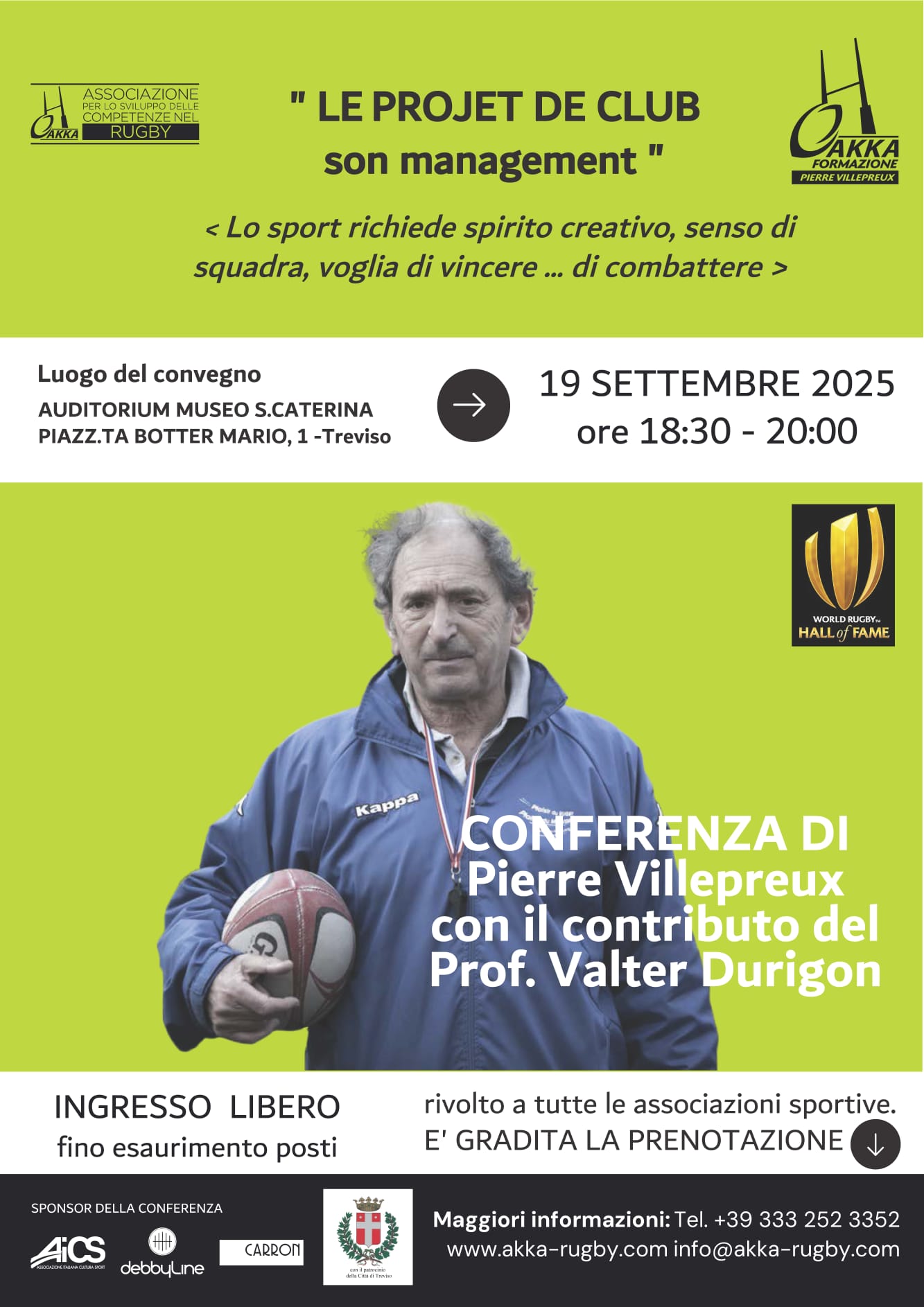 Il 19 settembre 2025, dalle ore 18.30 alle 20.00, presso l’Auditorium del Museo Santa Caterina a Treviso, si terrà una conferenza speciale con Pierre Villepreux, leggenda e membro della World Rugby Hall of Fame.